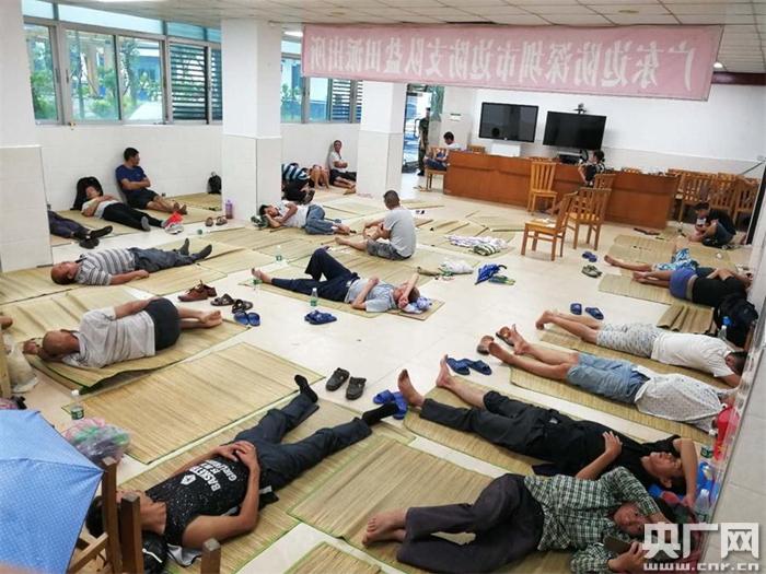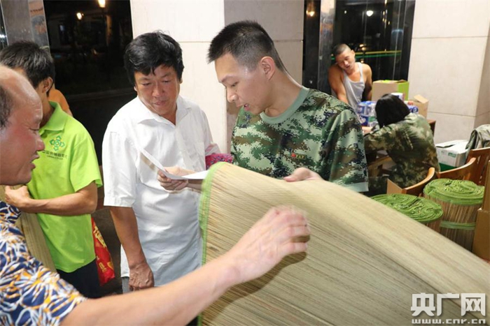 圖為深圳邊防支隊官兵向避險群眾派發(fā)涼席(央廣網(wǎng)發(fā) 林國浩 攝)