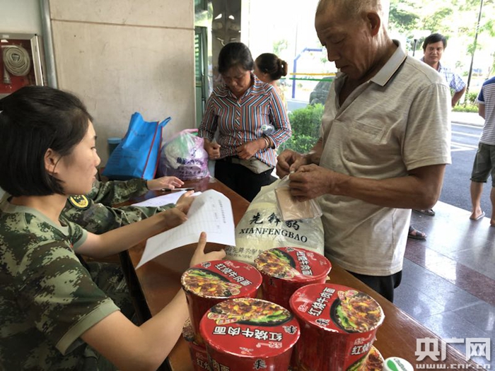 圖為深圳邊防支隊官兵向避險群眾派發(fā)食物(央廣網(wǎng)發(fā) 林國浩 攝)