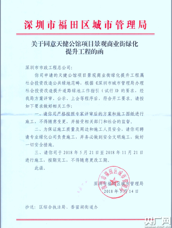 記者發(fā)現(xiàn),按照深圳市交通運輸委員會7月19日頒發(fā)的深圳市占用挖掘道路許可證中明確,天健公館人行道景觀提升工程的使用時間是截止到11月19日。深圳福田區(qū)城市管理局的批復函中施工日期截止日是11月21日。