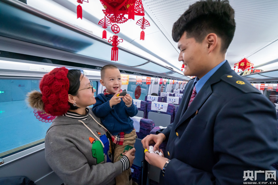 央廣網(wǎng)銀川1月19日消息(記者徐升)春節(jié)將至,銀川至中衛(wèi)南C8203次列車的車廂里掛滿了大紅燈籠、吉祥春聯(lián),車窗也貼上了的窗花,濃濃的新春祝福和鮮艷的中國紅將車廂裝扮一新。今年,寧夏迎來高鐵開通后的首個春運,銀川客運段工作人員特別為乘車旅客準備了豐富多樣的年俗文化活動,還為旅客準備了春運定制款窗花、春聯(lián)等小禮品。