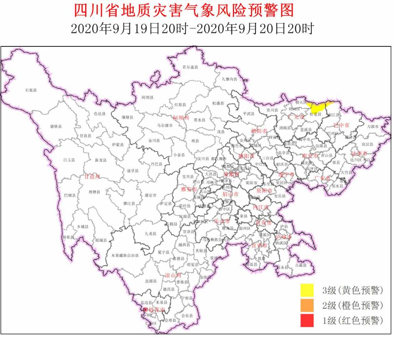 央廣網(wǎng)成都9月19日消息(記者劉濤)結(jié)合四川省氣象臺(tái)天氣預(yù)報(bào)情況,四川省地質(zhì)災(zāi)害指揮部辦公室發(fā)布9月19日20時(shí)~9月20日20時(shí),全省地質(zhì)災(zāi)害氣象風(fēng)險(xiǎn)3級(jí)黃色預(yù)警。