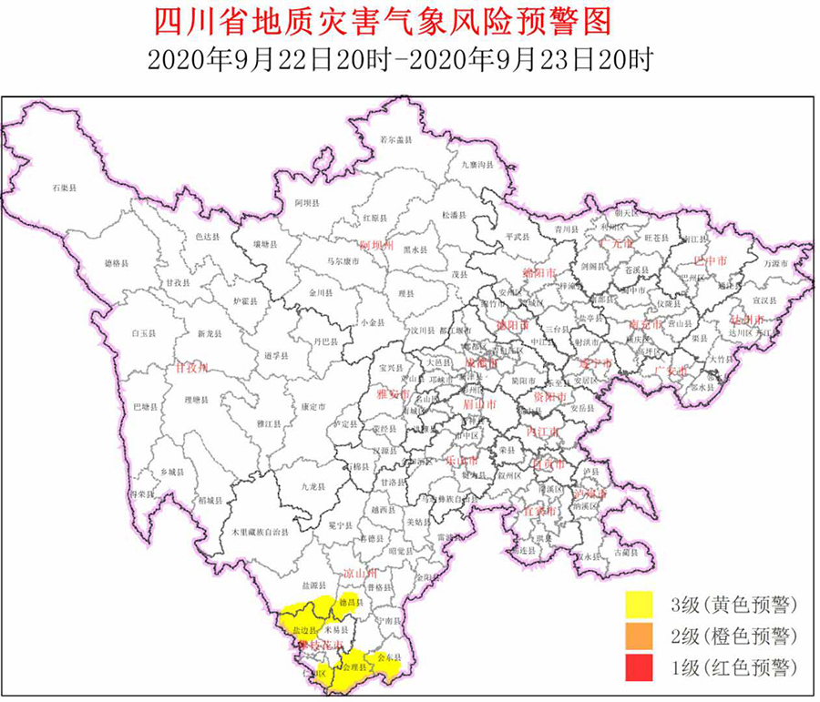 央廣網(wǎng)成都9月22日消息(記者劉濤)結(jié)合四川省氣象臺天氣預(yù)報情況,四川省地質(zhì)災(zāi)害指揮部辦公室發(fā)布9月22日20時至9月23日20時,全省地質(zhì)災(zāi)害氣象風(fēng)險3級黃色預(yù)警。