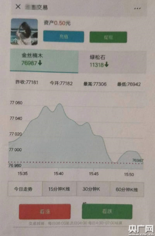 央廣網(wǎng)重慶11月12日消息(記者陳鵬)進入專門的“交易市場”,預(yù)估金絲楠木、綠松石、天麻、藏紅花、天然橡膠、澳洲紅酒、松茸等“商品”的漲跌,預(yù)測準(zhǔn)確則可獲利。這種高大上的“金融游戲”,吸引了大量網(wǎng)友入坑。而實際上,所謂的“市場”只是一位程序員編寫的小程序,漲跌全是人為操作。