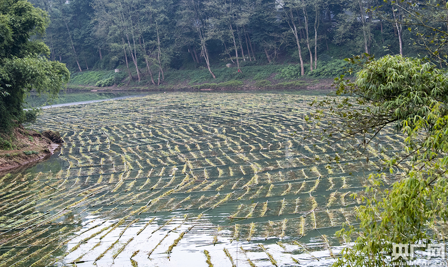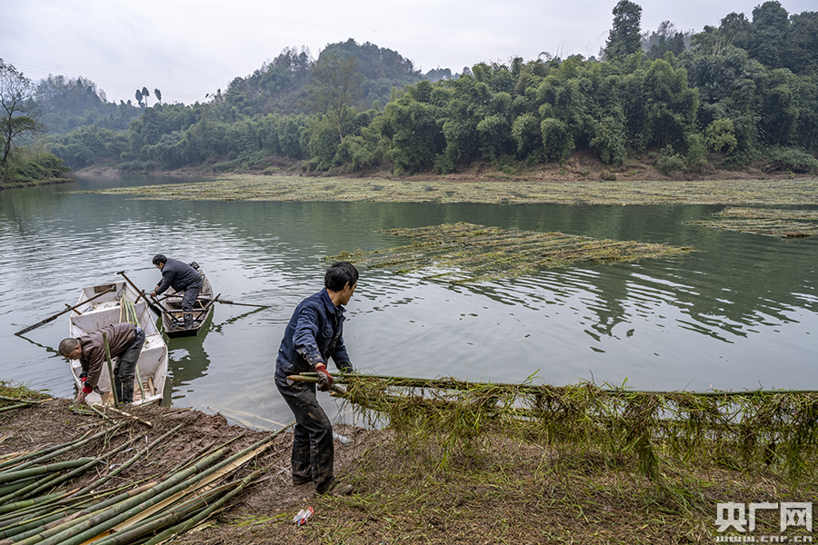 央廣網(wǎng)重慶1月6日消息(記者劉湛 通訊員袁孝椿)記者近日在重慶江津區(qū)塘河杜家沱河段看到,清澈的河面上,一排排整齊的竹竿結(jié)成陳列,靜悄悄地漂浮在水面上。每根竹竿上,都纏繞著一簇簇長長的水草。河水溫柔地從水草間無聲地淌過。河邊上,還有七八個工人在忙碌著。