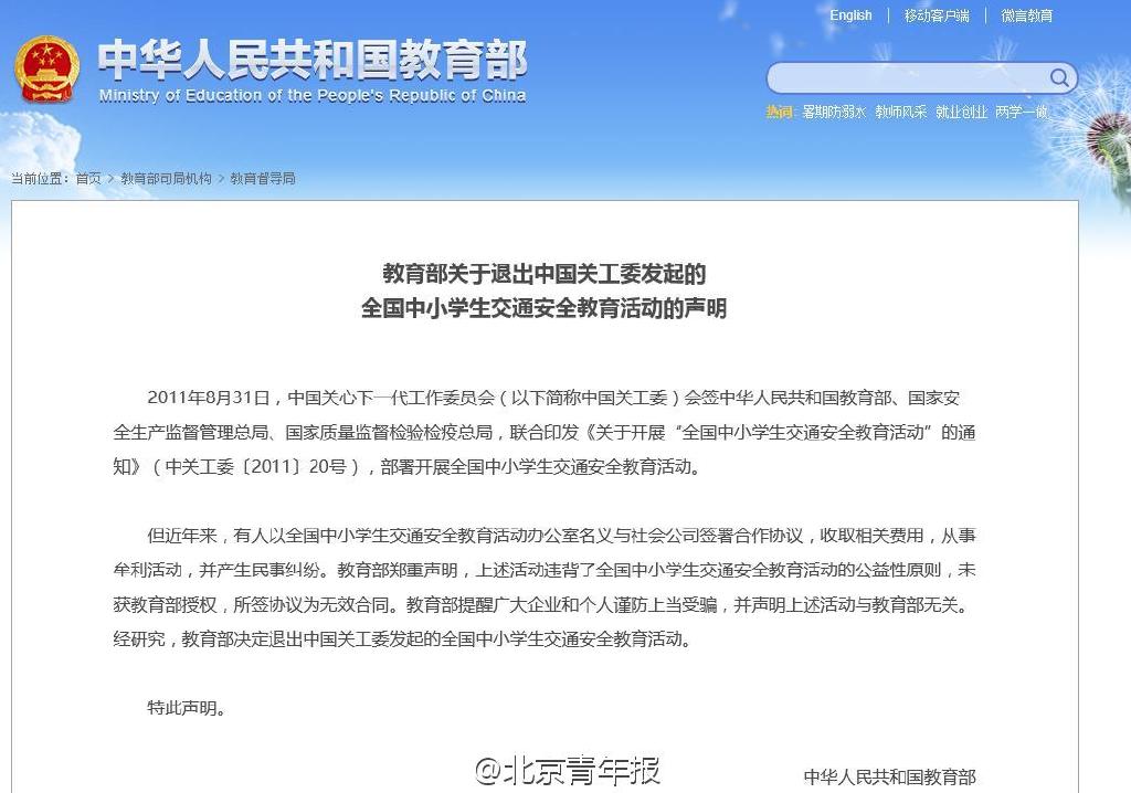 教育部近日發(fā)布聲明,決定退出中國關(guān)心下一代工作委員會發(fā)起的全國中小學(xué)生交通安全教育活動。今天,質(zhì)檢總局官網(wǎng)聲明同樣宣布退出該活動。今天下午北青報記者查詢?nèi)珖行W(xué)生交通安全教育活動辦公室的官方網(wǎng)站,主管單位一欄仍未撤掉“教育部”字樣,官網(wǎng)提供的辦公電話一直處于無人接聽狀態(tài)。