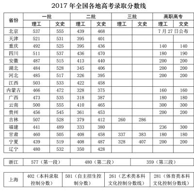 2017年全國部分地區(qū)高考錄取分數線