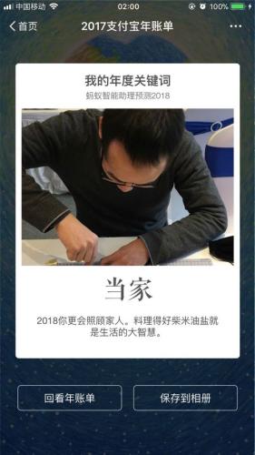 2017年支付寶年賬單中預(yù)測(cè)用戶2018年“我的年度關(guān)鍵詞”頁面。