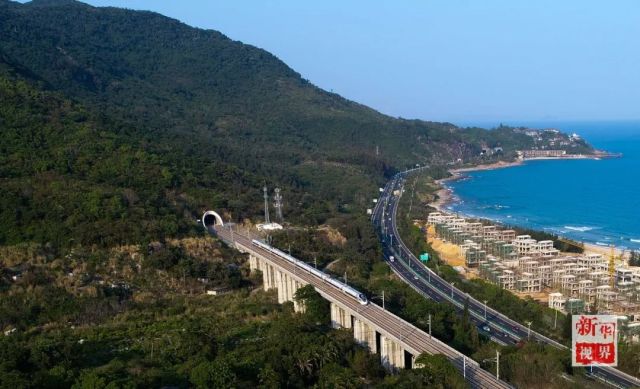 藍(lán)天碧海,文昌航天發(fā)射場箭指太空,三亞國際郵輪港碼頭萬噸郵輪矗立,環(huán)島高鐵火車飛馳……