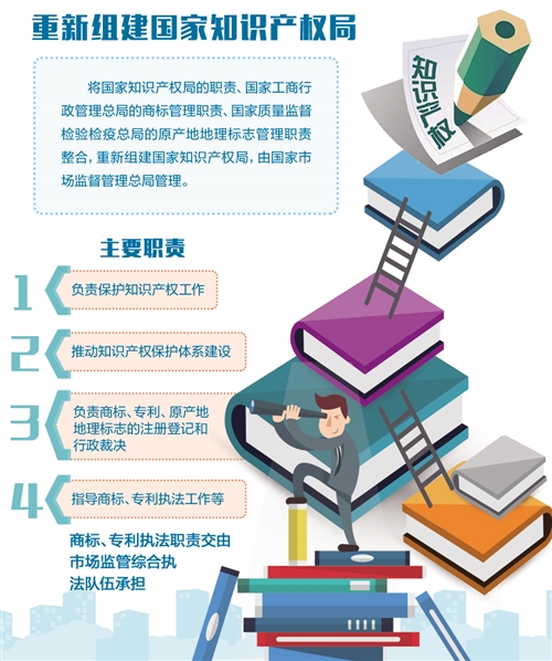 不久前,中共中央印發(fā)的《深化黨和國(guó)家機(jī)構(gòu)改革方案》明確提出,為解決商標(biāo)、專利分頭管理和重復(fù)執(zhí)法問(wèn)題,將國(guó)家知識(shí)產(chǎn)權(quán)局的職責(zé)、國(guó)家工商行政管理總局的商標(biāo)管理職責(zé)、國(guó)家質(zhì)量監(jiān)督檢驗(yàn)檢疫總局的原產(chǎn)地地理標(biāo)志管理職責(zé)整合,重新組建國(guó)家知識(shí)產(chǎn)權(quán)局,由國(guó)家市場(chǎng)監(jiān)督管理總局管理。