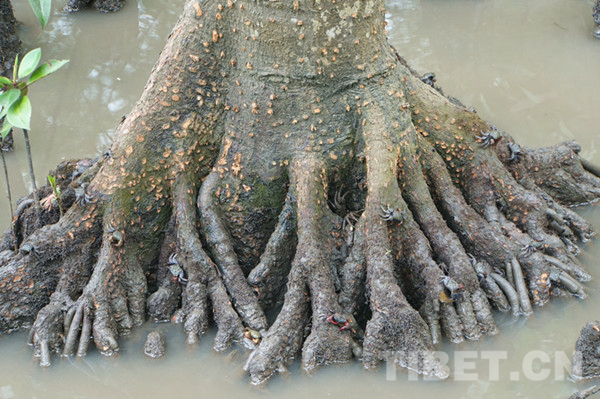 圖為大量的螃蟹爬上紅樹林的樹根,據(jù)說這種螃蟹是長不大的。
