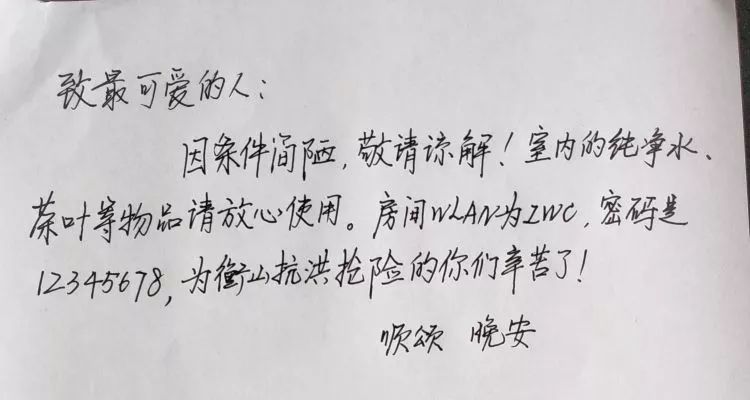 室內(nèi)的純凈水、茶葉等物品請放心使用。房間WLAN為ZWC,密碼是12345678,為衡山抗洪搶險的你們辛苦了!