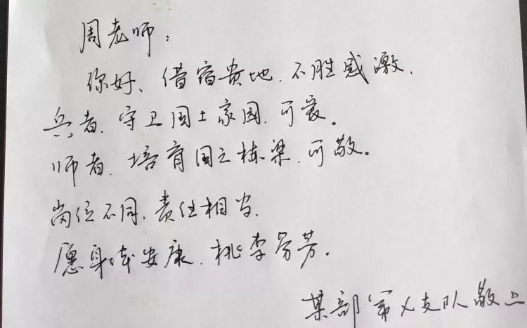 第二天早上,周老師趕到學(xué)校,發(fā)現(xiàn)辦公室里干凈整齊,如同原樣。他沒有見到武警官兵,但在那張白紙上,多了一段“回復(fù)”: