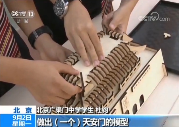 北京廣渠門中學(xué)學(xué)生 杜鈞:暑假的時(shí)候,我和我的同學(xué)用激光切割技術(shù)做出一個(gè)天安門的模型。今年是新中國成立70周年,這也是我們祝福祖國的一種心意。