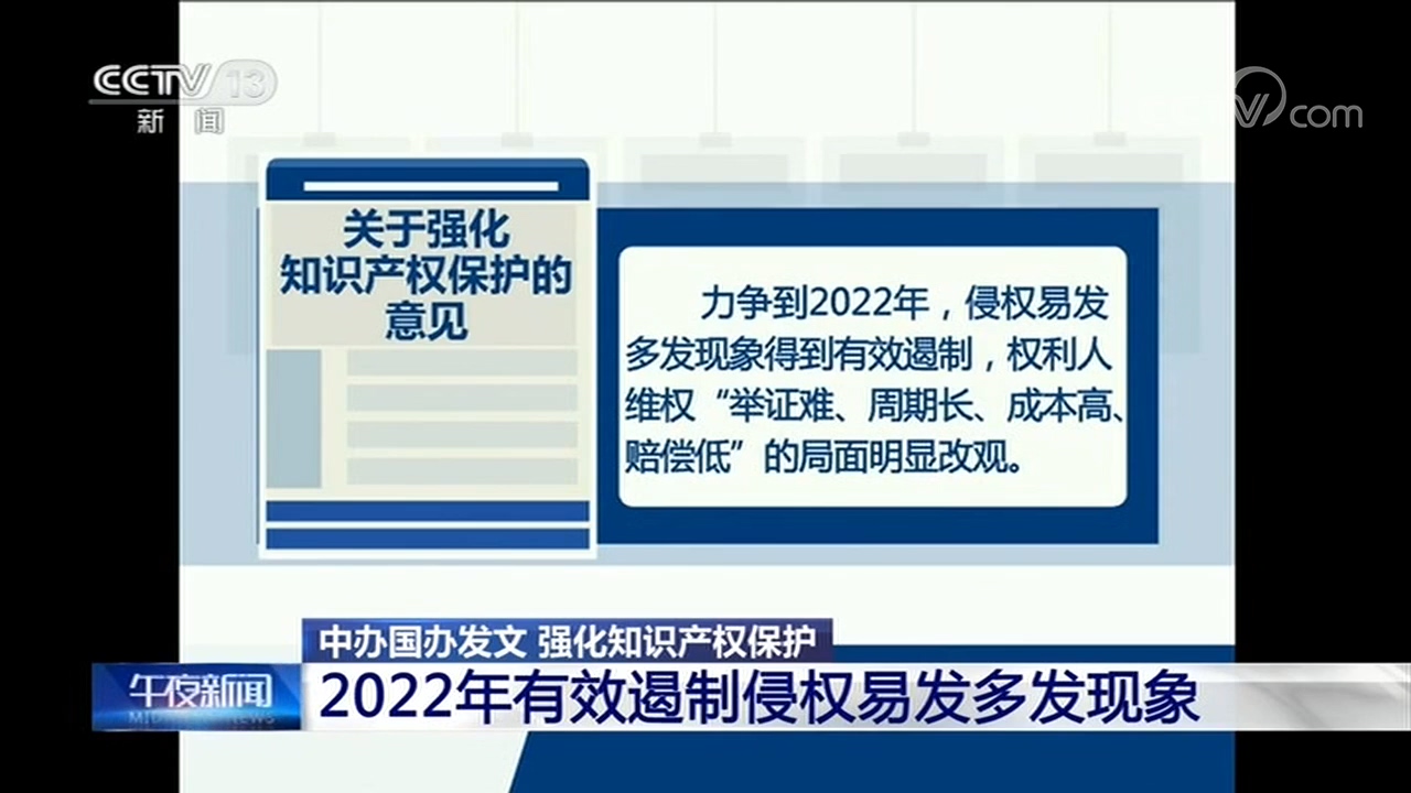 央視網(wǎng)消息:近日,中共中央辦公廳、國務(wù)院辦公廳印發(fā)了《關(guān)于強(qiáng)化知識產(chǎn)權(quán)保護(hù)的意見》(以下簡稱《意見》)并發(fā)出通知,要求各地區(qū)各部門結(jié)合實(shí)際認(rèn)真貫徹落實(shí)。
