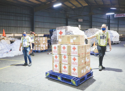 3月21日,搭載中國政府援助菲律賓醫(yī)療物資的包機抵達馬尼拉國際機場。圖為當(dāng)?shù)貦C場工作人員正在搬運物資。中國駐菲律賓大使館供圖