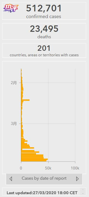 與此同時,境外疫情形勢嚴(yán)峻。世衛(wèi)組織實時統(tǒng)計數(shù)據(jù)顯示,截至歐洲中部時間3月27日18時(北京時間3月28日1時),全球確診新冠肺炎512701例,死亡23495例,目前全球已有201個國家地區(qū)出現(xiàn)新冠肺炎病例,中國以外新冠肺炎確診約43萬例。