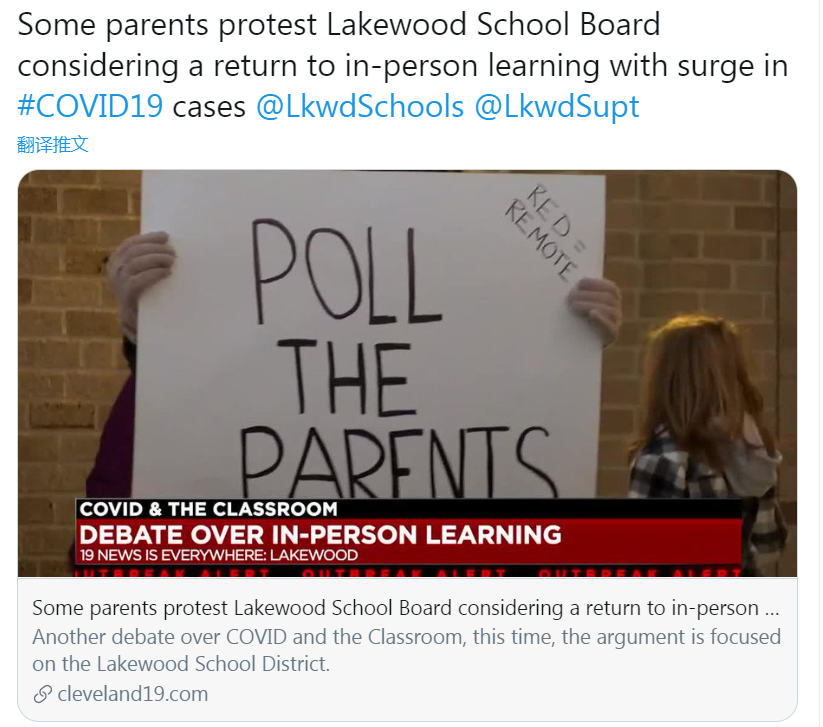 當(dāng)?shù)貢r(shí)間11月16日晚間,美國俄亥俄州萊克伍德高中門口聚集了大量的學(xué)生和家長,他們舉著“咨詢家長意見”、“堅(jiān)持遠(yuǎn)程授課”和“不要謀殺教師”等標(biāo)語,抗議學(xué)校在當(dāng)?shù)匾咔槌掷m(xù)擴(kuò)散的情況下,堅(jiān)持重啟面對面授課的計(jì)劃。而同一天在美國新澤西州亞特蘭大市,超過200名教職工集體罷工,以抗議學(xué)校在重啟的同時(shí),缺乏相應(yīng)的新冠病毒防控措施。這些教師表示,校方?jīng)]能兌現(xiàn)此前有關(guān)翻修學(xué)校通風(fēng)系統(tǒng)的承諾,甚至還用地毯烘干機(jī)來冒充空氣凈化器。