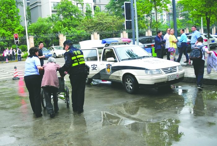 李婆婆在成都七中初中學(xué)校門口得到民警幫助。鐘先生供圖