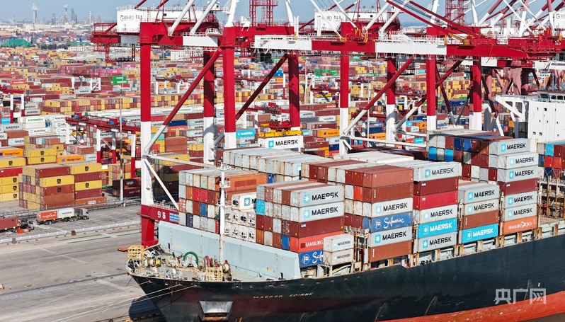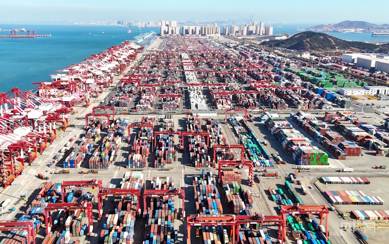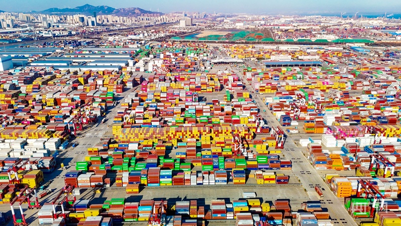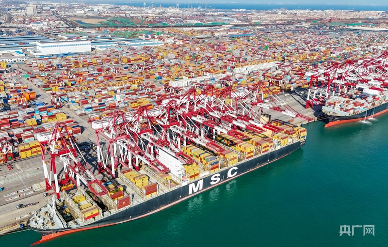 12月8日,山東港口青島港集裝箱堆場(chǎng)一派忙碌。(央廣網(wǎng)發(fā) 張進(jìn)剛 攝)