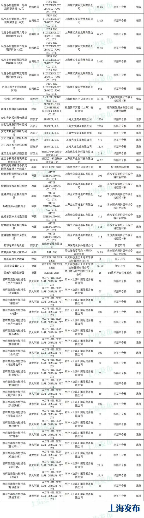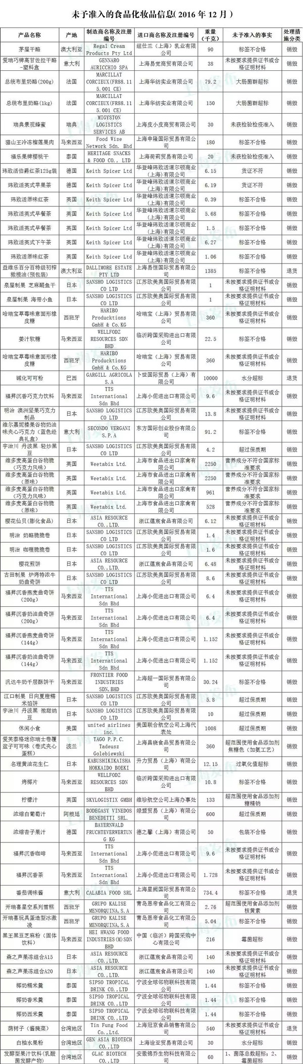 央廣網(wǎng)上海2月10日消息 上海出入境檢驗檢疫局今天公布去年12月份未予準入的進境食品、化妝品信息,包括法國產(chǎn)的總統(tǒng)布里奶酪、泰國產(chǎn)的福樂果牌櫻桃干、英國產(chǎn)的瑋致活原味紅茶、德國產(chǎn)的歌薇染發(fā)膏、澳大利亞產(chǎn)的澳莉芙澳優(yōu)純橄欖皂等。未予準入的產(chǎn)品都已依法作退貨或銷毀處理。