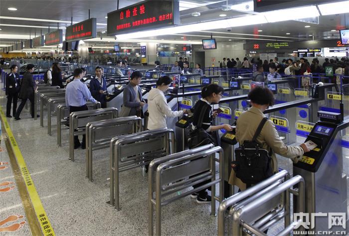 旅客正在新建的自助通道內(nèi)自助通關(guān)。(央廣網(wǎng)發(fā) 鄧楠楠 攝)