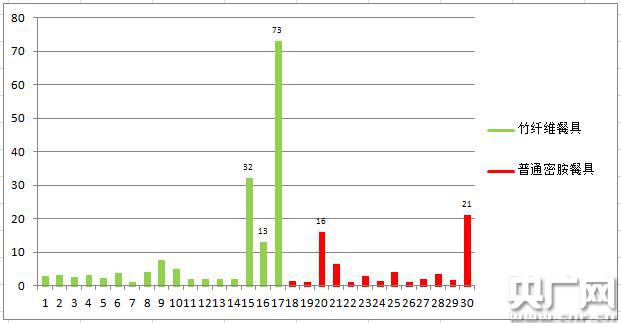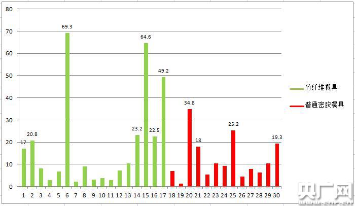 本次比較試驗共計購買30件樣品,其中線上16件,線下14件,包括了17件標(biāo)稱含竹纖維的餐具,13件普通密胺餐具,價格從7.9元至89元不等。