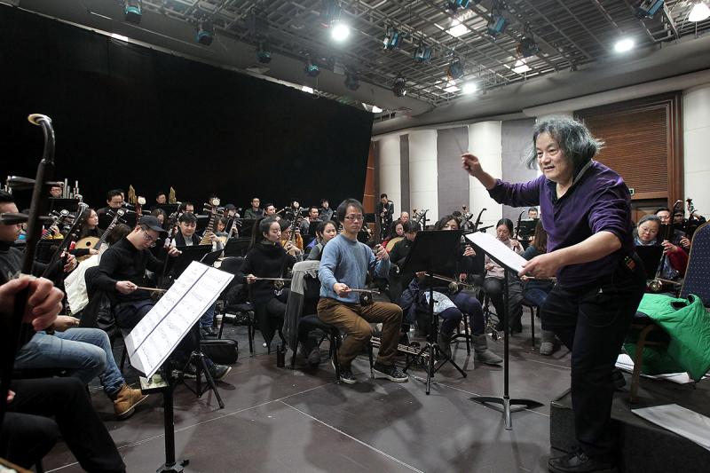 上海民族樂團(tuán)在湯沐海指揮下進(jìn)行歐洲巡演項(xiàng)目《海上生民樂》音樂會版排練。