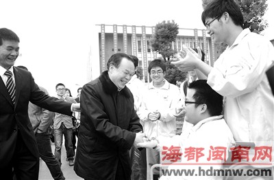 上午9時許,周其鳳一下車,便與學(xué)生握手,情緒激動的學(xué)生紛紛涌向他,索要簽名,而周其鳳接過學(xué)生的紙筆逐一為他們簽名后,并與學(xué)生擁抱。一位殘障的學(xué)生引起周其鳳的注意,他特地留步勉勵這名殘障學(xué)生。