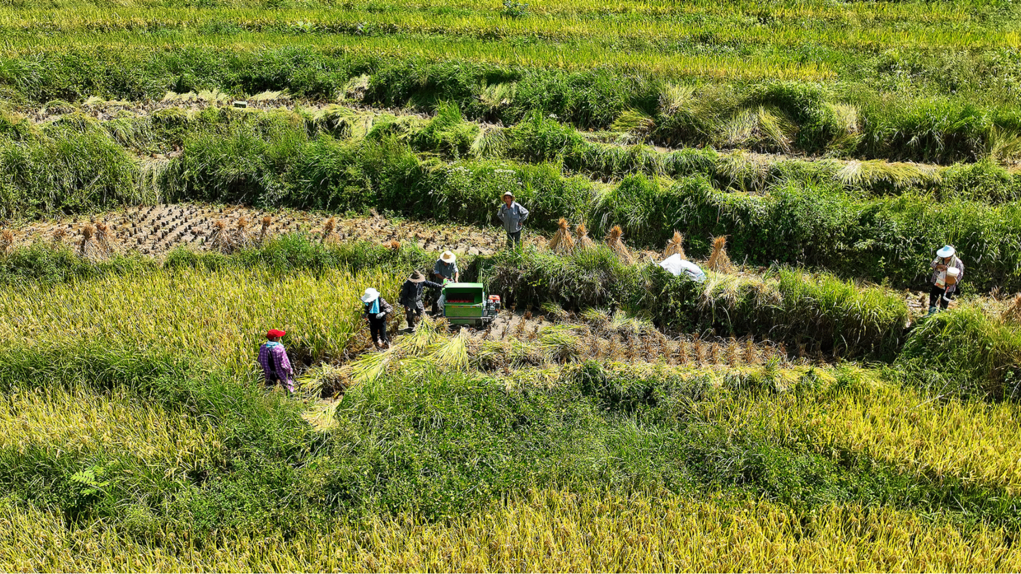 層層疊疊的梯田上,稻穗低垂、金黃遍野,農戶們穿梭其間,小型農機的轟鳴聲與歡笑聲交織,描繪出一幅忙碌而喜悅的豐收畫卷。