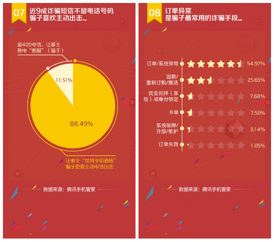 通過(guò)騰訊手機(jī)管家近8億用戶舉報(bào)的大數(shù)據(jù),發(fā)現(xiàn)有88.49%的詐騙短信不會(huì)留聯(lián)系方式,而是留下釣魚(yú)網(wǎng)址,讓受害人輸入銀行賬號(hào)密碼;還有些會(huì)留下400電話,讓受害人回?fù)芎笤龠M(jìn)行詐騙。