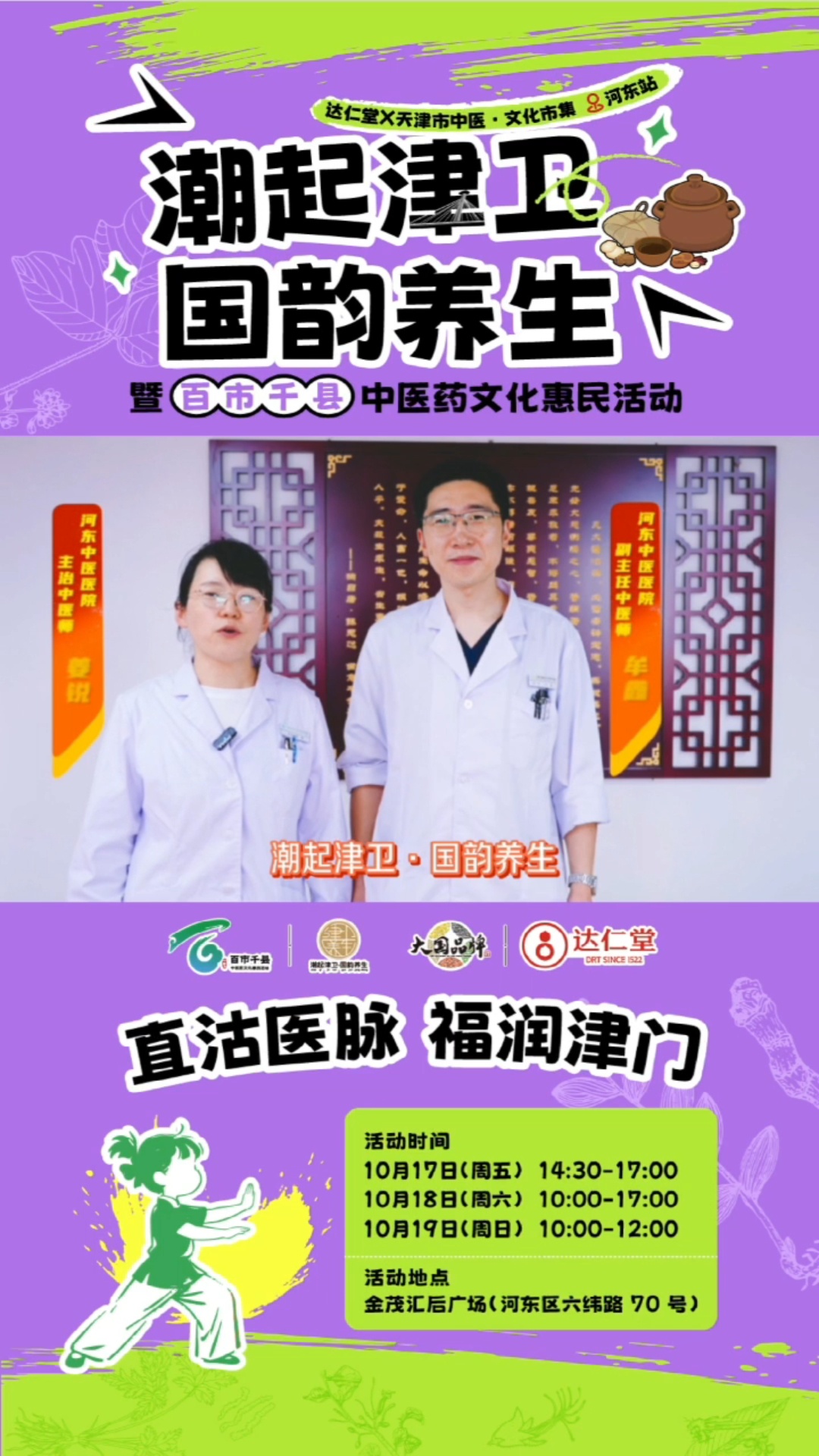 10月17日至19日,由津藥達(dá)仁堂獨(dú)家總冠名的“潮起津衛(wèi)·國韻養(yǎng)生”天津市中醫(yī)文化市集河?xùn)|站將隆重舉行。