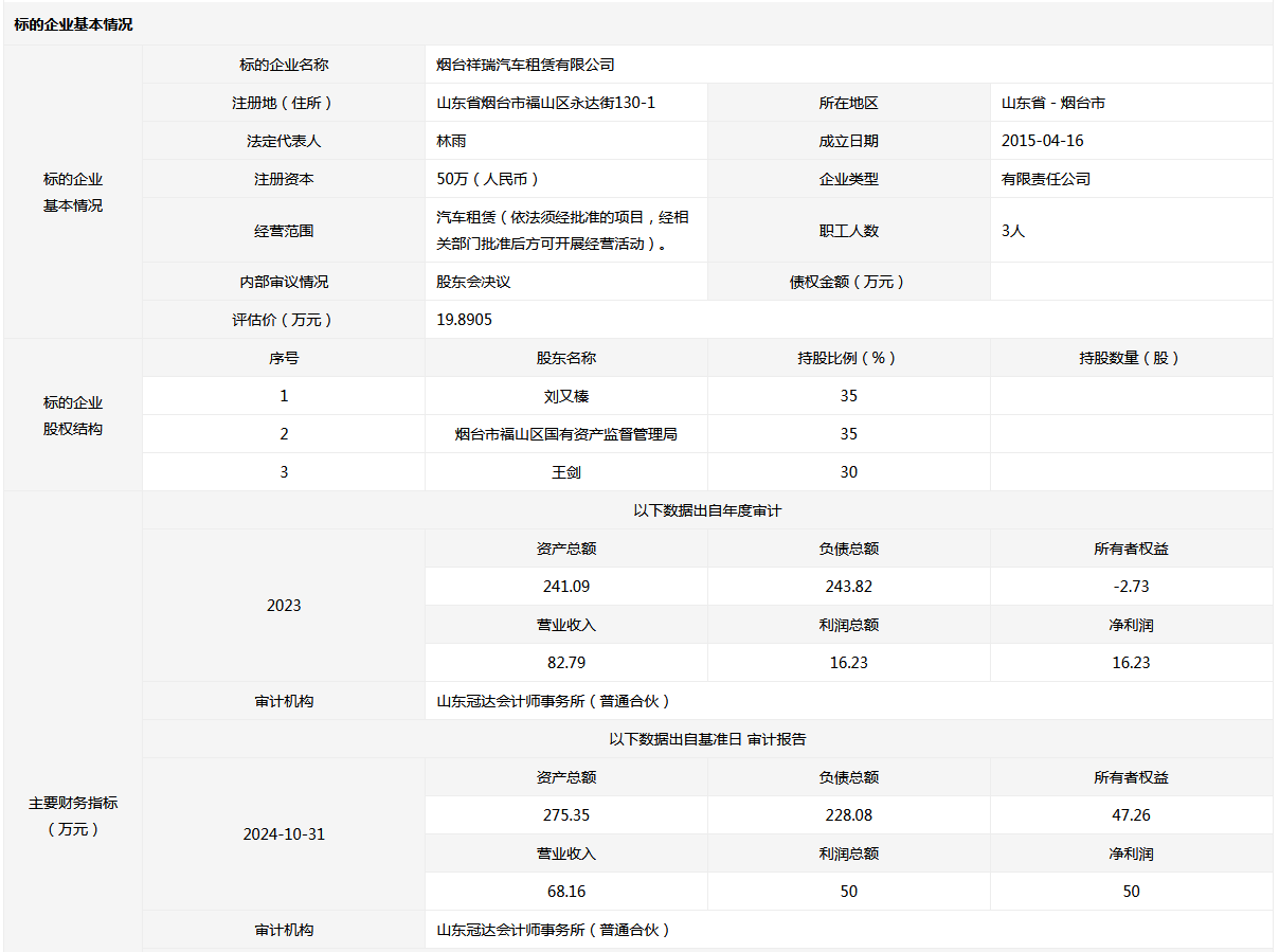 煙臺(tái)祥瑞汽車(chē)租賃有限公司35%國(guó)有股權(quán)