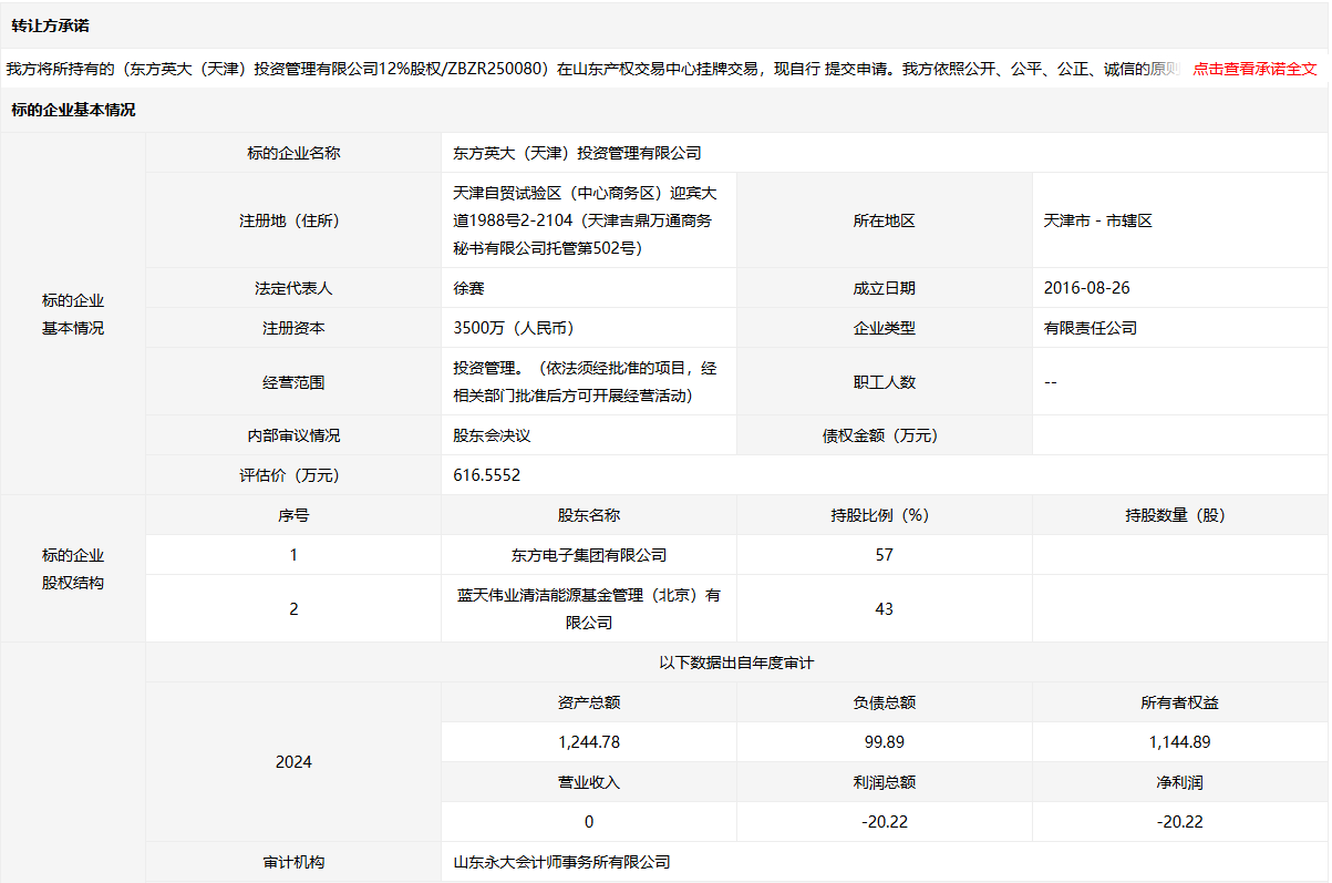 東方英大(天津)投資管理有限公司12%股權(quán)