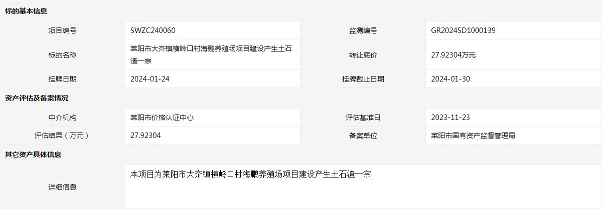 海陽市辛安鎮(zhèn)卓格莊村CX項目平整土地產(chǎn)生部分渣土一宗(3號標的)交易公告