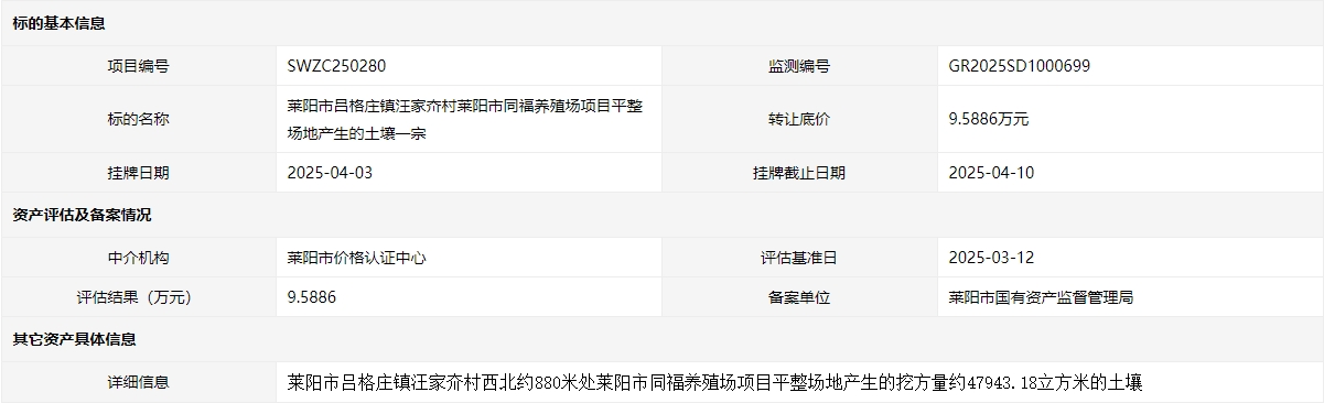 萊陽市呂格莊鎮(zhèn)汪家夼村萊陽市同福養(yǎng)殖場項目平整場地產生的土壤一宗