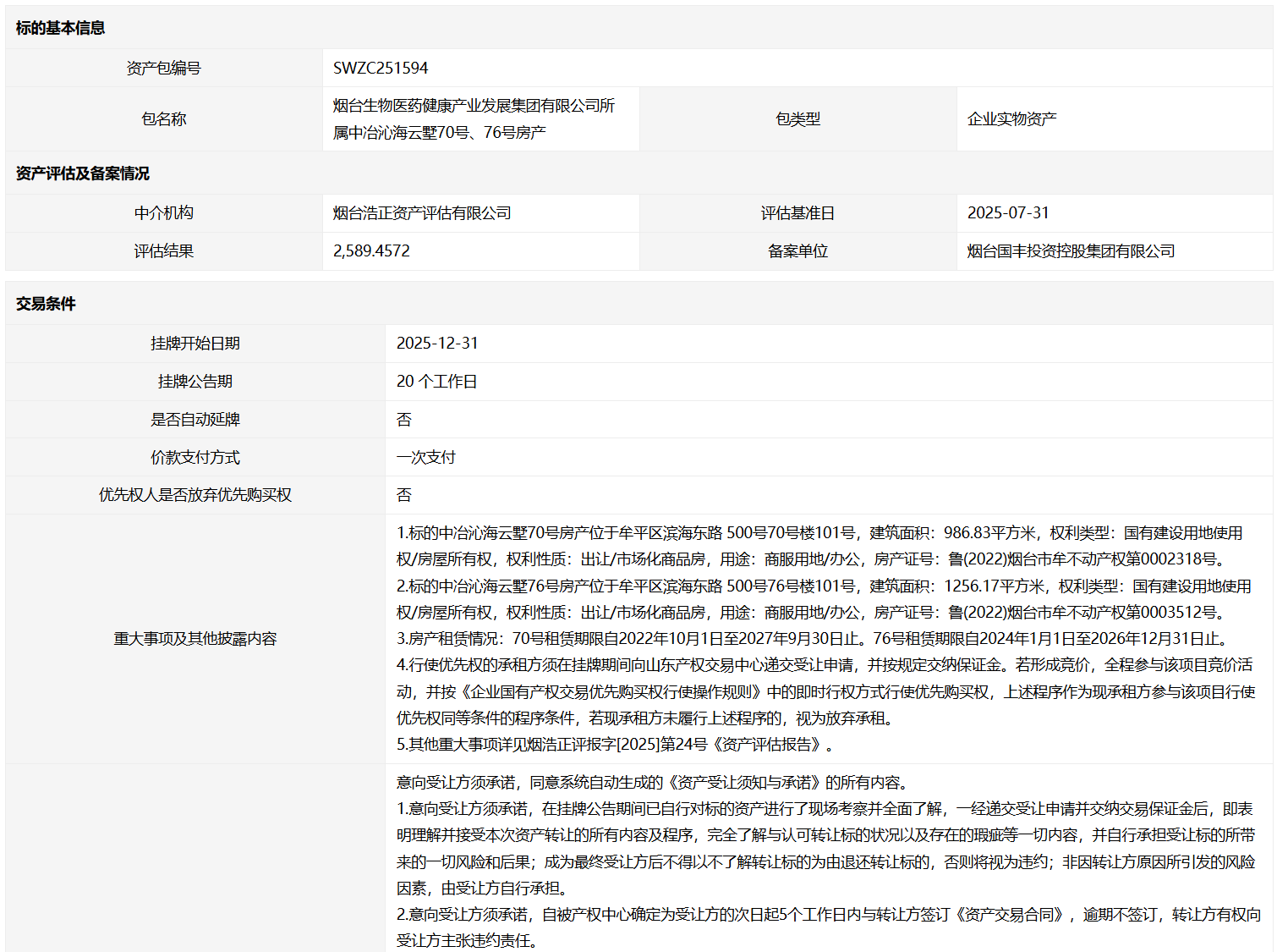 煙臺生物醫(yī)藥健康產(chǎn)業(yè)發(fā)展集團有限公司所屬中冶沁海云墅70號、76號房產(chǎn)