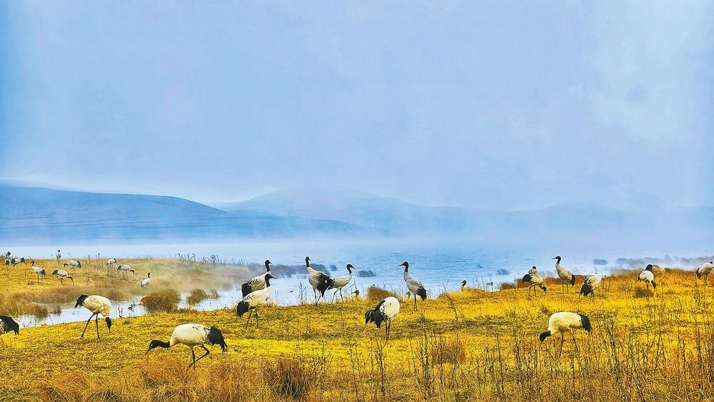 圖為黑頸鶴自由覓食。(記者 沈迅 通訊員 李劍 余汝毅)