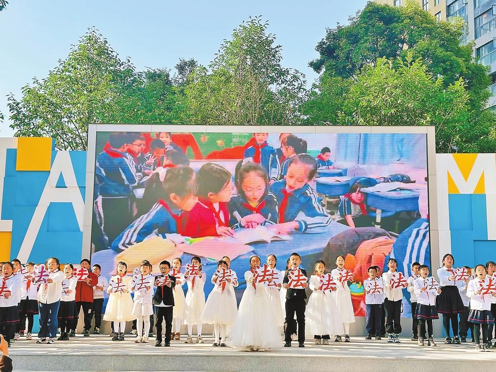 “同學(xué)們,我們生活在一個(gè)美麗、安寧的校園里,是什么在默默守護(hù)著我們?”隨著主持人的提問(wèn),音樂(lè)劇《憲法伴我成長(zhǎng)》精彩亮相。法治理念入童心“學(xué)法明理,弘揚(yáng)法治,歌聲飛揚(yáng),享受權(quán)利,履行義務(wù),敬法用法,和諧共享……”朗朗上口的詞句,道出了法治社會(huì)的美好愿景,號(hào)召同學(xué)們從身邊小事做起,將憲法精神融入日常學(xué)習(xí)與生活,做尊法守法的小公民。