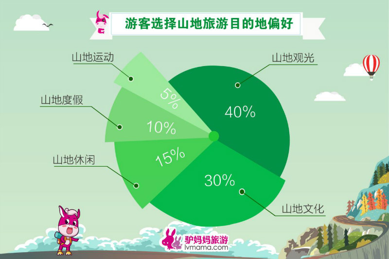 《報(bào)告》根據(jù)驢媽媽游客消費(fèi)行為數(shù)據(jù)分析,目前超過40%的游客會選擇山地觀光為主的目的地。傾向體驗(yàn)山地文化的游客占到了30%的比例,特別是少數(shù)民族聚居區(qū)和宗教文化濃厚的山地區(qū)域。而選擇山地休閑游的比例占到了 15%,此類旅游資源大多分布在城市近郊。另外也有10%的游客選擇山地度假。值得一提的是,選擇山地運(yùn)動(dòng)的游客增長趨勢明顯,占比超過5%,游客參與的山地運(yùn)動(dòng)項(xiàng)目包括徒步、滑雪、露營和馬拉松等。