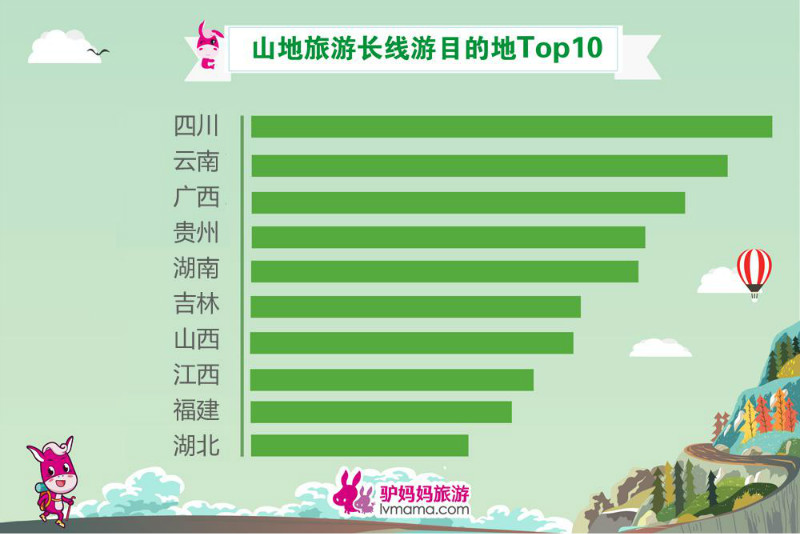 《報(bào)告》根據(jù)過去一年驢媽媽平臺上預(yù)訂山地旅游產(chǎn)品和景區(qū)門票的數(shù)據(jù),統(tǒng)計(jì)出了最受山地游客歡迎的周邊游目的地和長線游目的地。黃山、成都、舟山、湖州、樂山、臨安、清遠(yuǎn)、泰安、承德、金華成為國內(nèi)十大熱門山地周邊游目的地。而長線用戶則更加偏愛四川、云南、廣西、貴州、湖南、吉林、山西、江西、福建、湖北等擁有豐富山地旅游資源的省份。