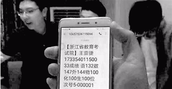 “我晚上7點(diǎn)多接到王雷捷的電話,告訴我他得了浙江第一,我高興得要蹦起來,發(fā)了一條朋友圈,然后手機(jī)就炸了!蓖趵捉莸陌嘀魅侮惲x老師說,她是浙江第一個(gè)發(fā)布王雷捷高考奪魁的人!拔艺J(rèn)為王雷捷得到第一不算特別意外,他的成績在學(xué)校里一直都是第一的,如果考得不好反而不正常!蓖趵捉荼救说故峭Φ,戴著黑框眼鏡的他,靜靜地站在老師身邊,一直在手機(jī)上接收各種祝福。