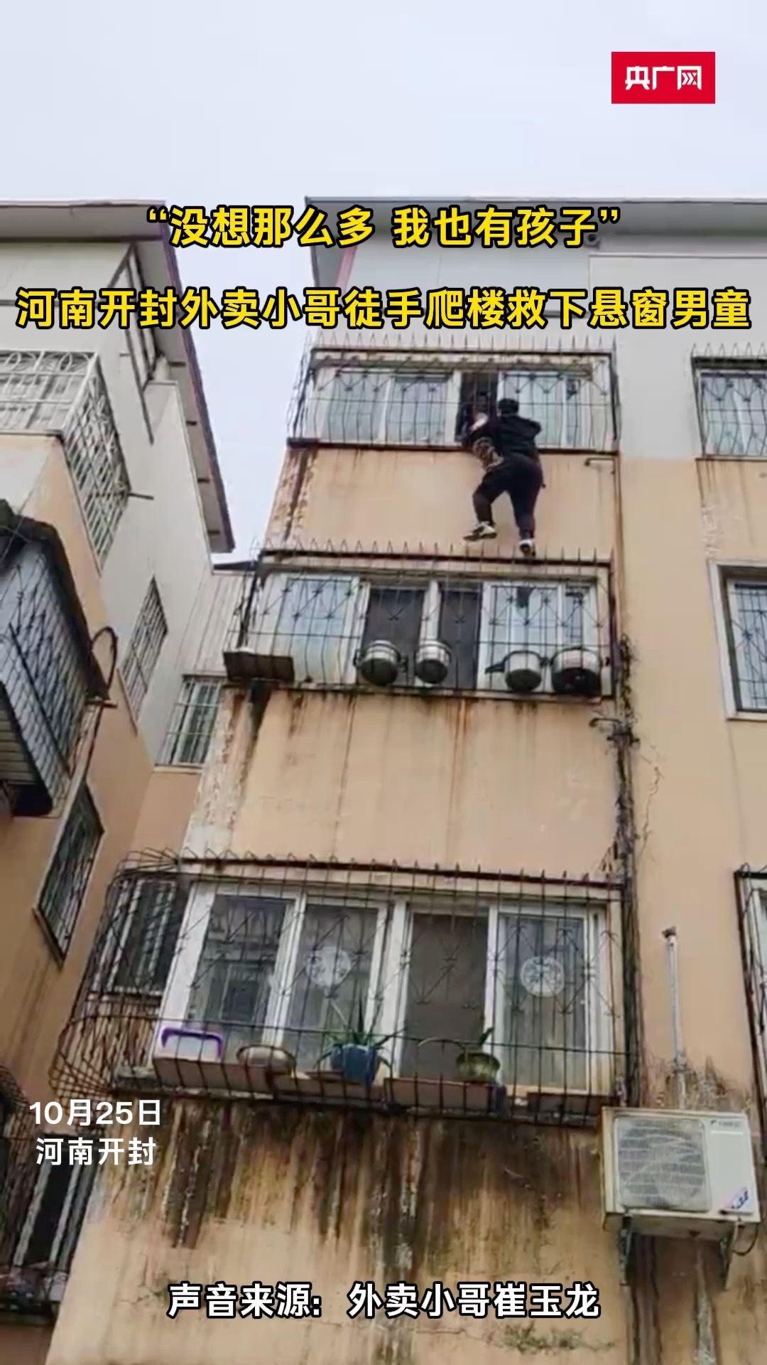 河南開封外賣小哥徒手爬樓救下懸窗男童。